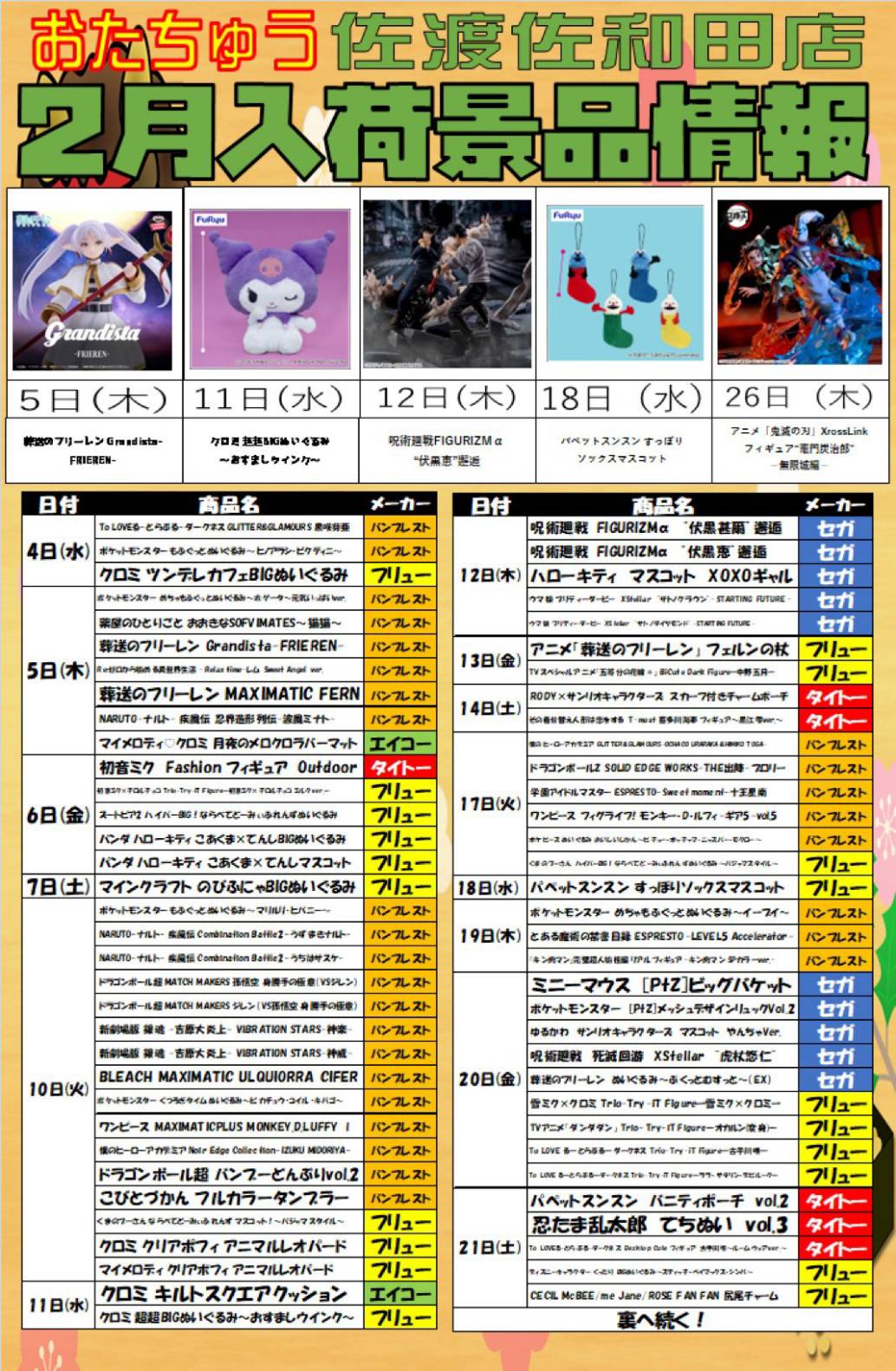 2月入荷景品カレンダー🗓️ お待たせしました❗…