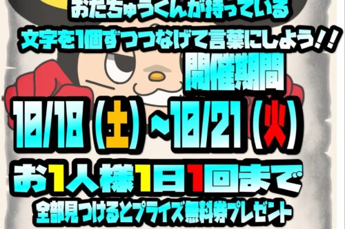 ■プライズSNS更新いたしました!★《10/18~24》おたちゅう君を探せ 開催します!■
